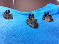 Then come the first complete unit from my Dystopian Wars fleet. #StPiransPicket Three KoB Tribal cruisers. Again fun to paint, Menoth White Base is a lovely colour.